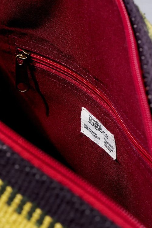 Handmade duffel bag with Navajo pattern features 2 short straps and adjustable shoulder strap as well. Two slip pockets and zipper pocket inside.
